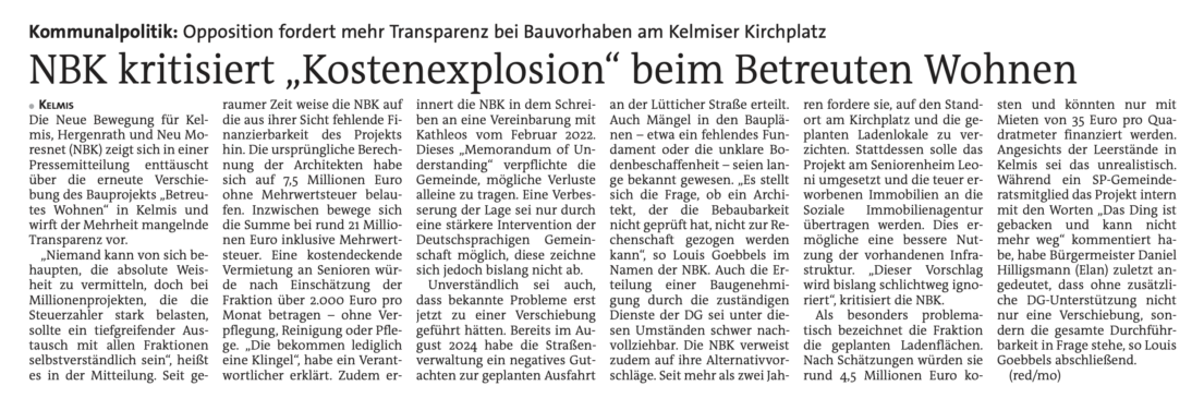 Die Kelmiser Oppositionsliste NBK kritisiert die erneute Verschiebung des Bauprojekts "Betreutes Wohnen" in Kelmis. In einer Pressemitteilung wirft sie der Mehrheit mangelnde Transparenz vor. Sie will auch stärker an den Entscheidungen über das Projekt beteiligt werden.