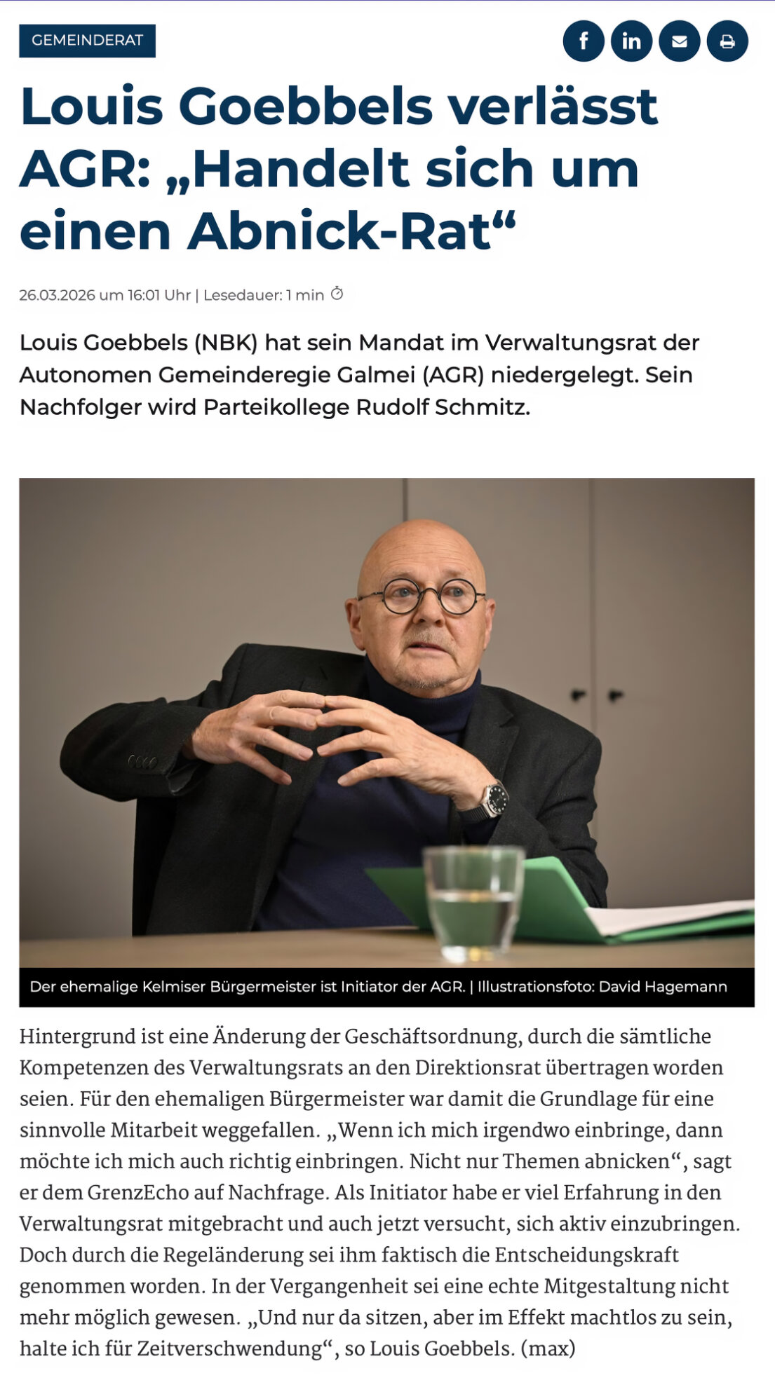 Im Verwaltungsrat der Autonomen Gemeinderegie kommt es zu einer personellen Veränderung: Louis Goebbels ist zurückgetreten, sein Mandat übernimmt Rudolf Schmitz. Nach einer Änderung der Geschäftsordnung in der letzten Legislatur seien sämtliche Kompetenzen des Rates an den Direktionsrat übertragen worden. Das mache den Verwaltungsrat nach einer einstimmigen Entscheidung durch den Direktionsrat überflüssig und die Beteiligung im Verwaltungsrat zu einer Zeitverschwendung, so Goebbels.