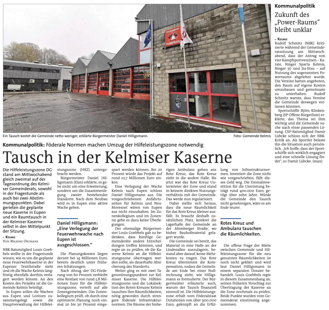 Bereits zuvor war die Hilfeleistungszone Thema in der Fragestunde. Louis Goebbels (NBK) erkundigte sich nach den Planungen für die neue Kaserne in der Eupener Textilstraße. Dort sollen die Wachen aus Eupen und Lontzen zusammengelegt sowie die Hauptverwaltung der Hilfeleistungszone angesiedelt werden. In dem Zusammenhang fragte er unter anderem, ob die Wache der Gemeinde Kelmis auch an diesen Standort verlegt werden soll.
